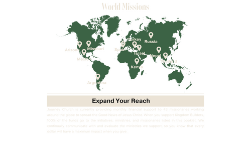 We are merging Journey Missions and Legacy into one new fund called Kingdom Builders. We will continue to support global and local missions through Kingdom Builders.