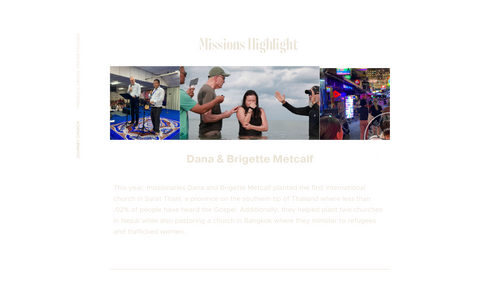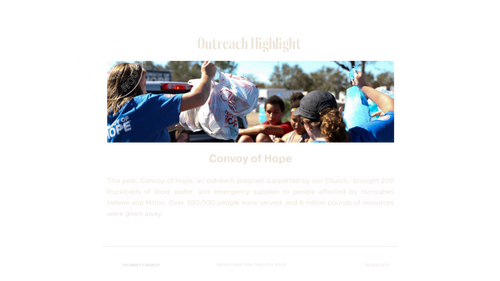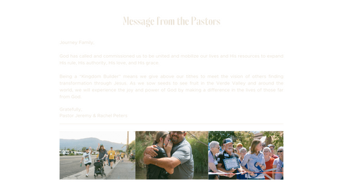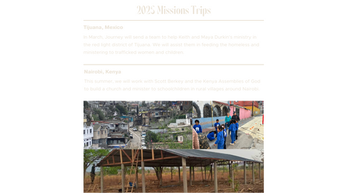 We are merging Journey Missions and Legacy into one new fund called Kingdom Builders. We will continue to support global and local missions through Kingdom Builders.