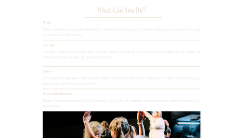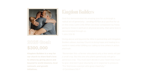 Kingdom Builders is not intended to take from what you are already doing but to provide additional giving to specific ministries and projects through Journey Church to help meet the vision that God has put on our hearts as a church body.